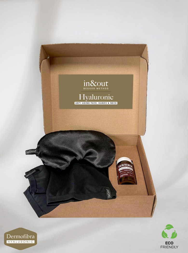 Erfahre die revolutionäre Methode Hyaluronic Anti Aging: Gesicht, Hände und Hals! Sie verbindet die Regenerationskraft des natürlichen Nährungsergänzungsmittels Skin Renew (IN) mit den Kleidungsstücken von BeGood aus Dermofibra Hyaluronic (OUT), um die Hautalterung zu behindern.