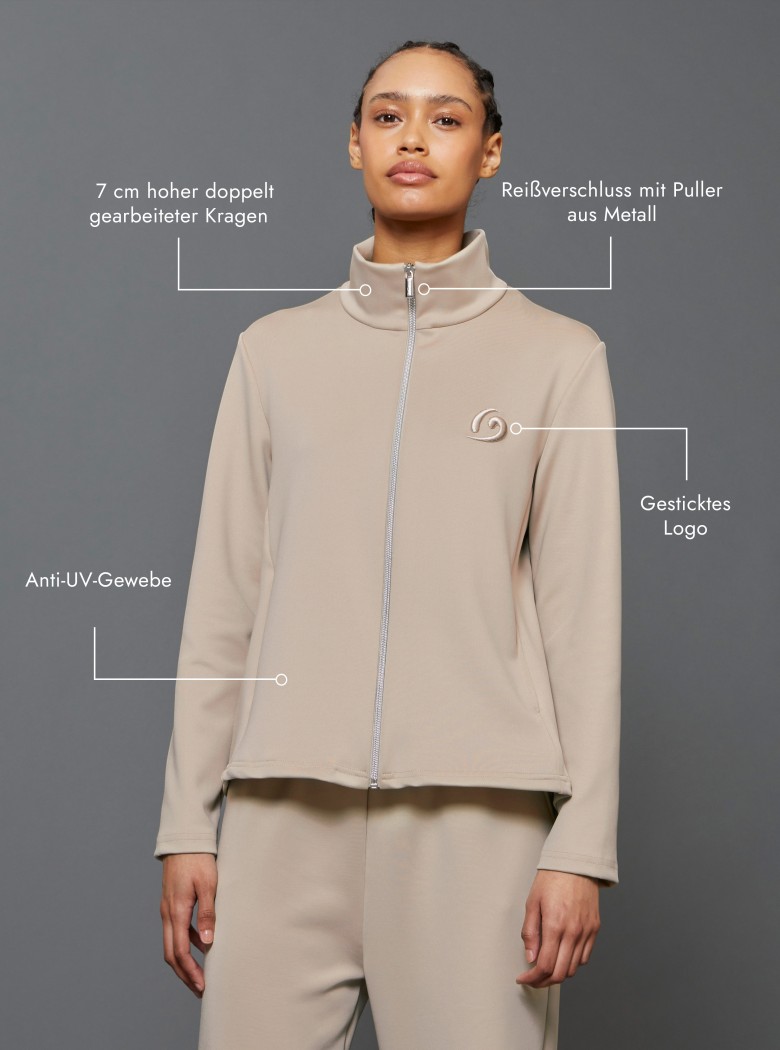 Die vorderen Taschen, gefertigt aus demselben Stoff, vereinen Stil und Funktionalität. Das Anti-UV-Gewebe schützt die Haut vor UV-Strahlen und macht diese Jacke zum idealen Begleiter für jede Jahreszeit.
