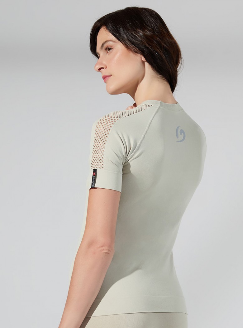 Ein modellierendes und UV-Schutzgewebe, das aus recyceltem Garn besteht. Es strafft und regt die Zirkulation an, es bietet Atmungsaktivität und Komfort an, während du Yoga treibst, und schützt die Haut von ultravioletten Strahlen.
