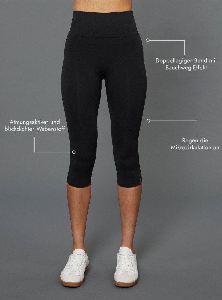 Schön und fit Beine von innen und außen. Undurchsichtiges Capri Legging mit Kompression und mit modellierendem, entwässerndem und feuchtigkeitsspendendem Effekt: Sie stimulieren die Mikrozirkulation und reduzieren Cellulite-Imperfektionen. Getestete Ergebnisse, sichtbar nach nur 10 Tagen regelmäßiger Anwendung.Perfekt für die Beinesdurchblotungsverbesserung.