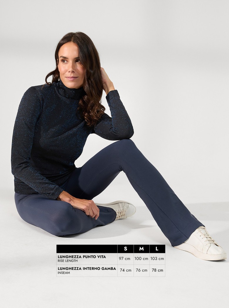 Der nicht umklappbare Bund ist 10 cm hoch und gewährleistet einen flachen Bauch-Effekt. Das regelmäßige Ausstellen der Jazzhose mit einem eleganten Einsatz, der bis zum Knie reicht bietet eine makellose Linie.