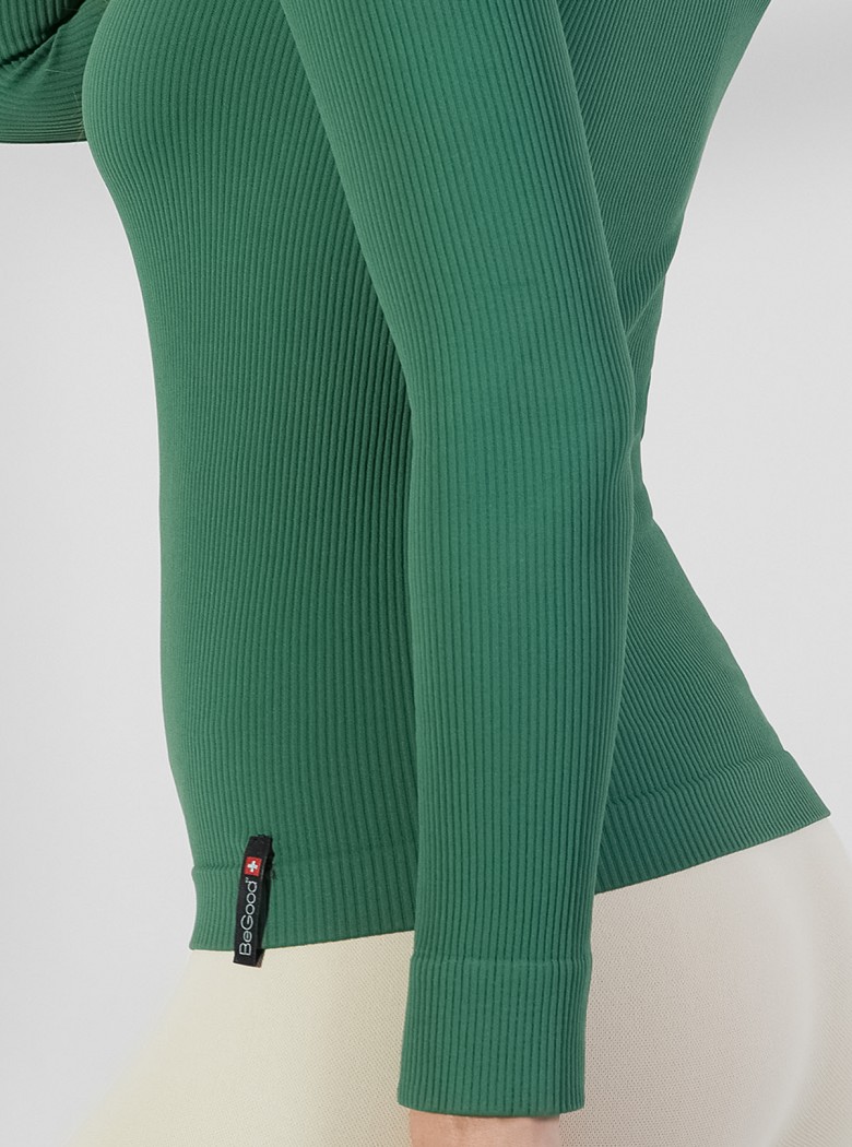 Ein Rippbündchen-Rollkragenpullover voller Wohlbefinden: mit dem feuchtigkeitsspendenden, straffenden und abnehmenden Stoff Dermofibra® Cosmetics.