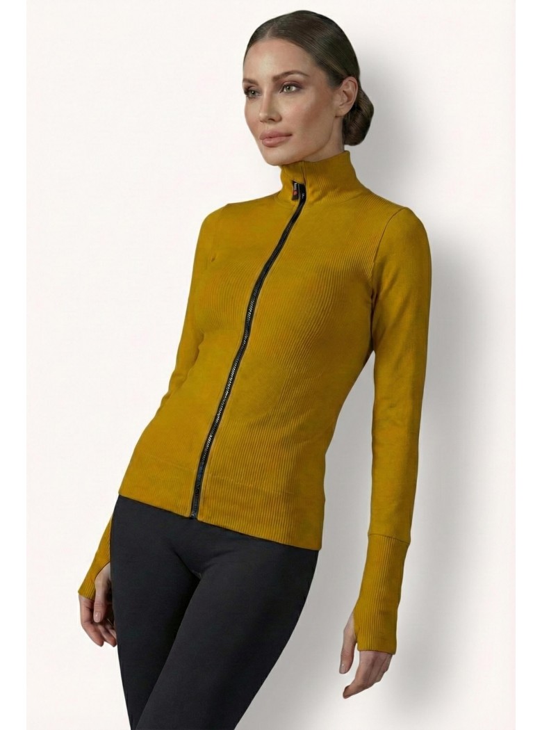 Die schmale Passform unterstreicht deine Silhouette, während der Kontrast zwischen Rippstrick und glatten Ärmeln ein modernes Spiel aus Texturen schafft.