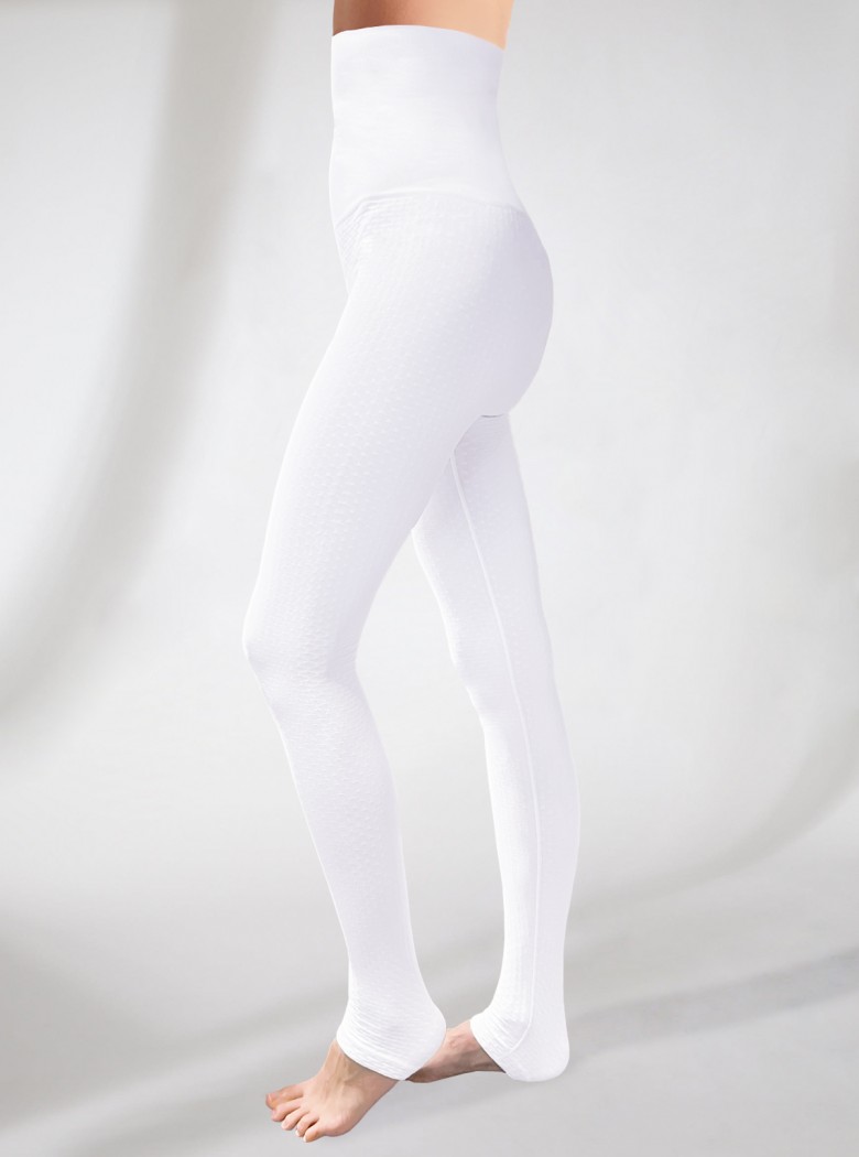 Lose yourself in the embracing experience of the white leggings, designed specifically to be your ally during the night hours. Their honeycomb texture gives a gentle massage and wraps your body from your belly to the soles of your feet to guarantee a complete treatment.