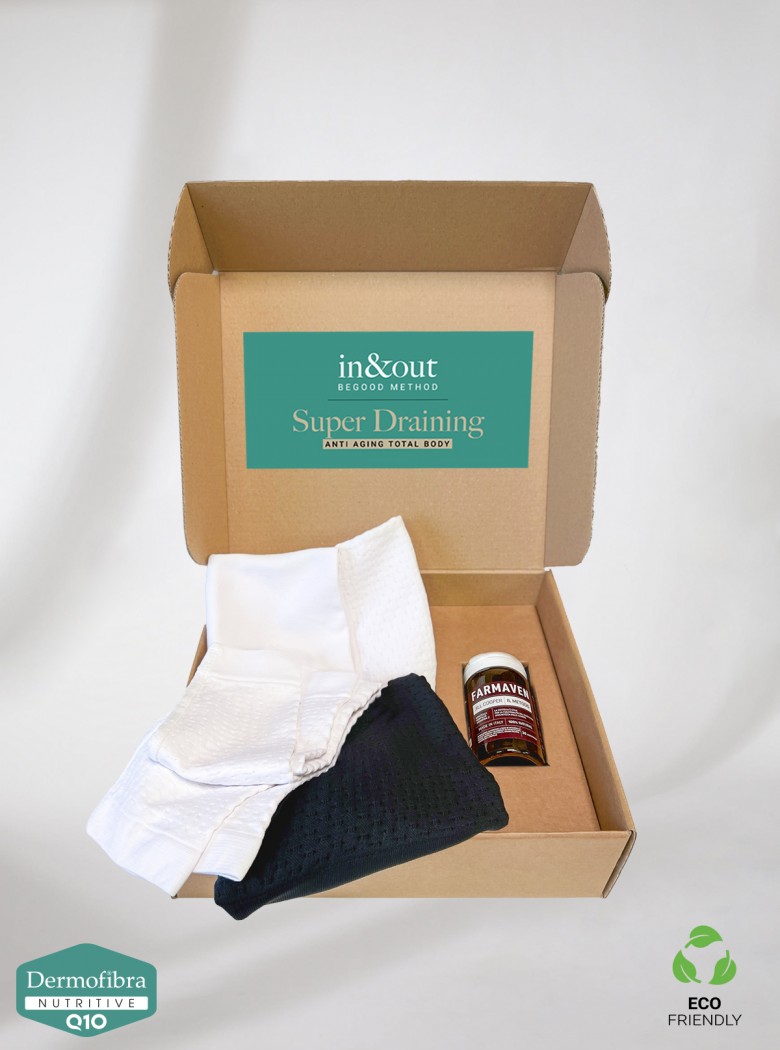 Explore the revolutionary super- draining In &Out Anti Aging method: Total Body. Experience visible results in just 30 days! It combines the regenerating power of the natural supplement Farmaven (IN) with BeGood items of clothing of Dermofibra Nutritive Q10 (OUT) to fight skin imperfections of your legs and arms.