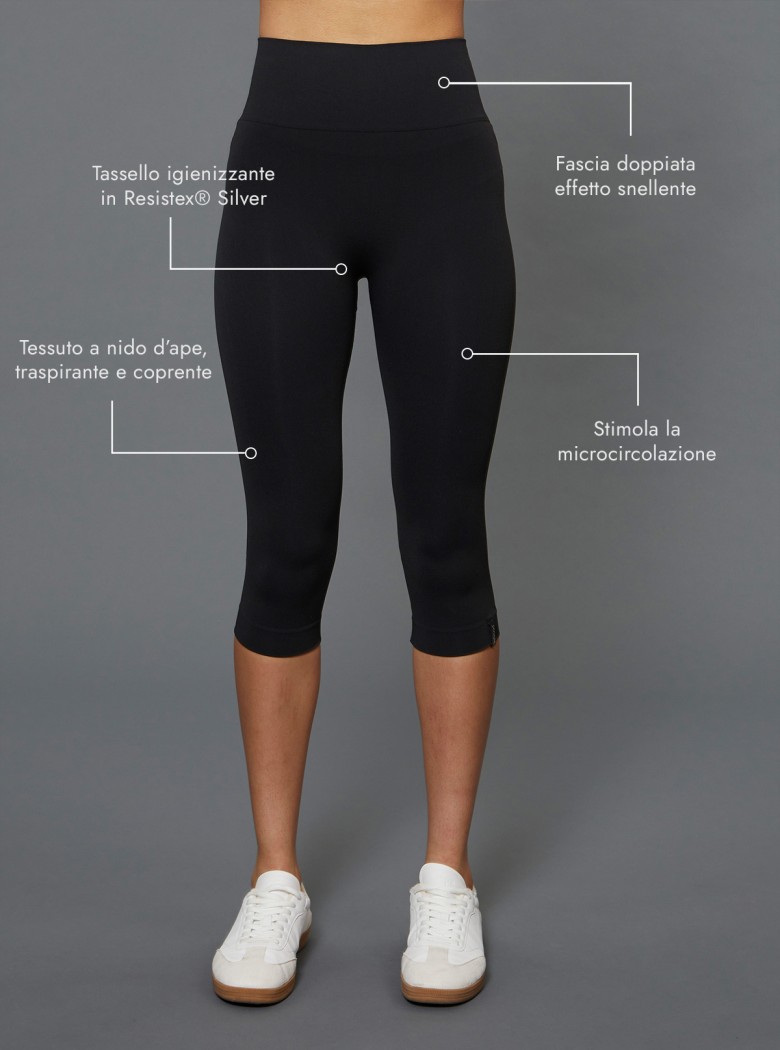 Opaque Capri Legging with modeling, draining and moisturizing effect: they stimulate microcirculation and reduce cellulite imperfections. Tested results, visible after only 10 days of regular use.