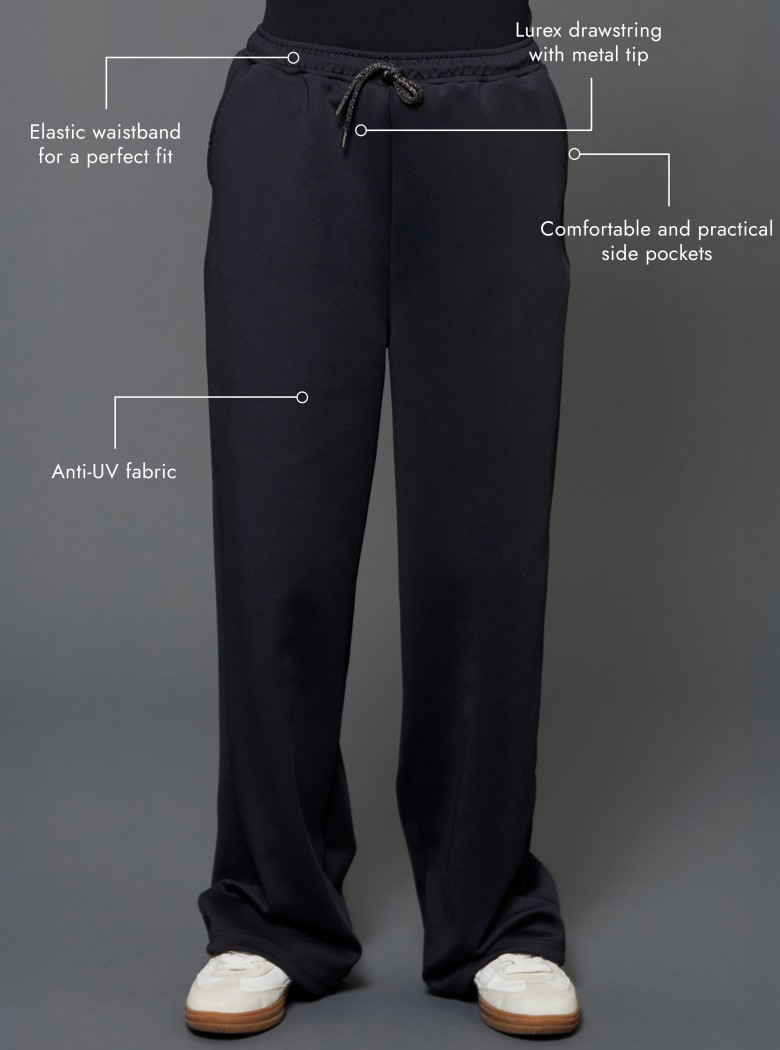 The lurex drawstring with metal tip and elastic waistband ensure a perfect fit.