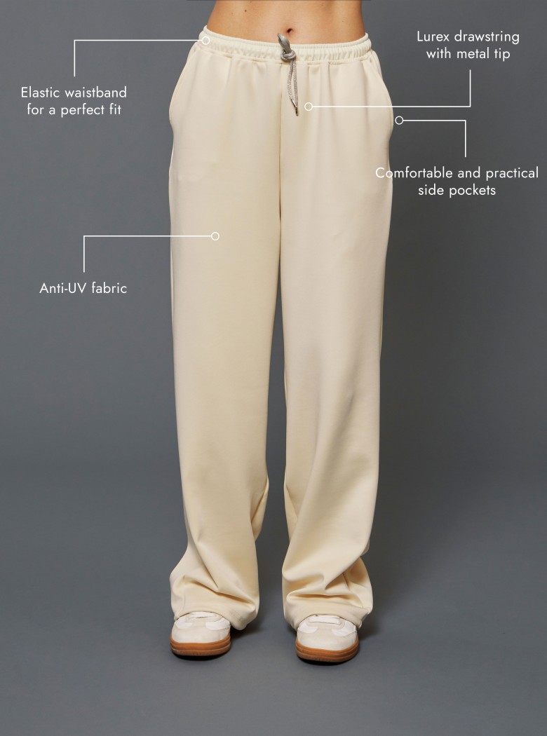 The lurex drawstring with metal tip and elastic waistband ensure a perfect fit.