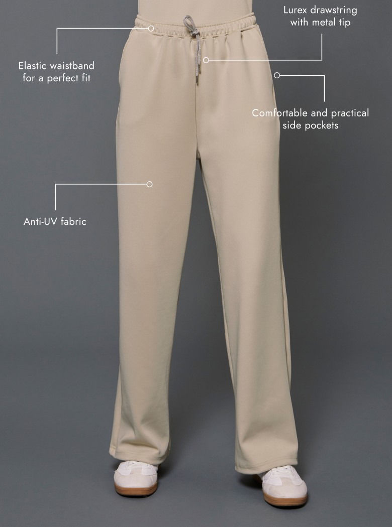 The lurex drawstring with metal tip and elastic waistband ensure a perfect fit.