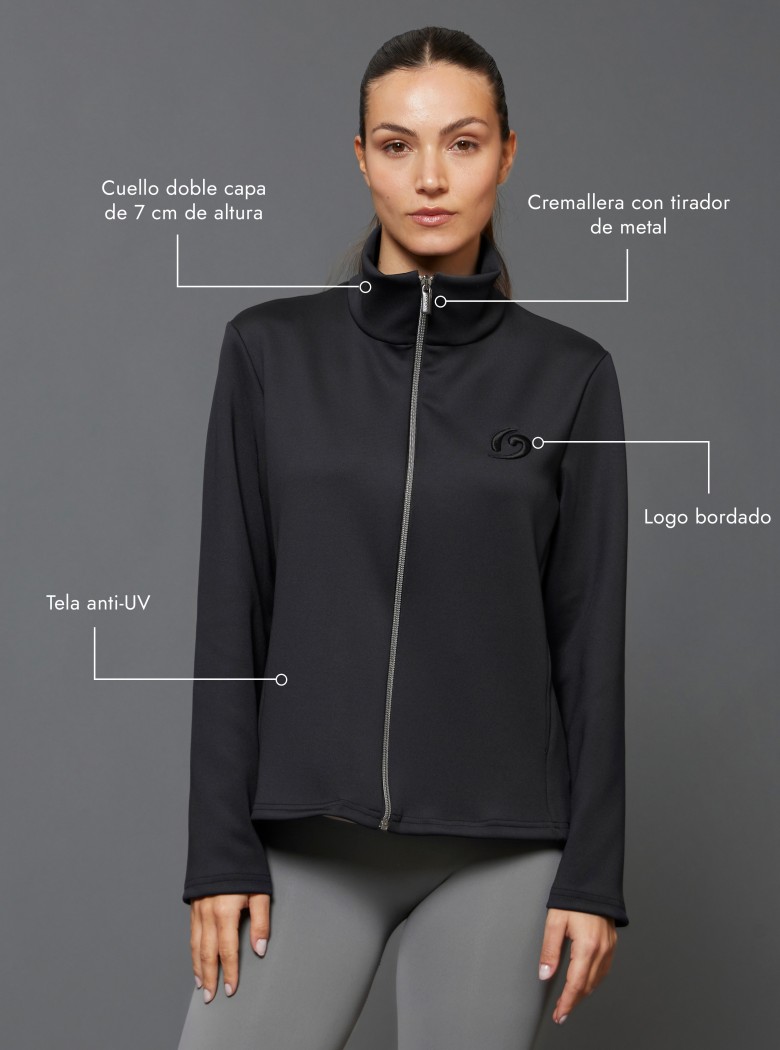 Los bolsillos frontales, confeccionados en el mismo tejido, combinan practicidad y estilo, mientras que el tejido anti-UV protege la piel de los rayos ultravioleta, haciendo que esta chaqueta sea perfecta para cualquier estación.