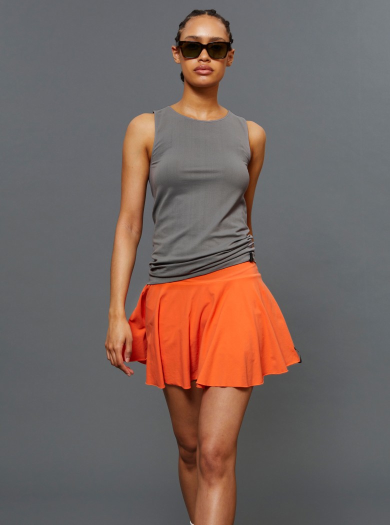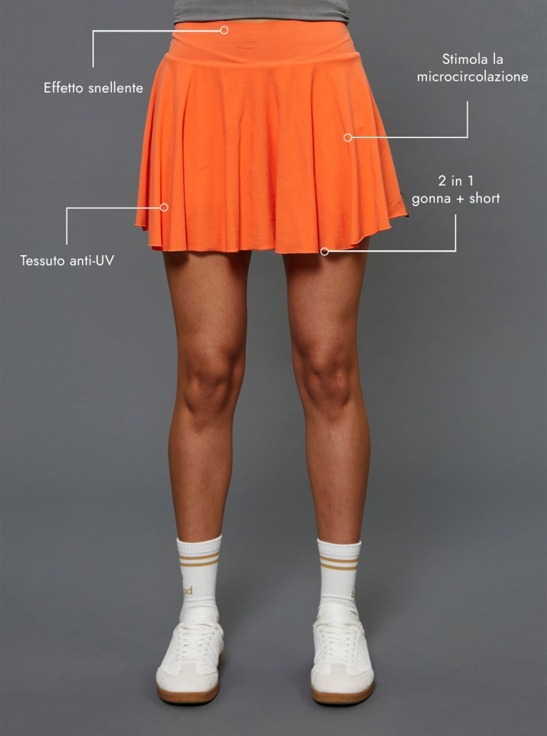 Redescubre la feminidad con una falda 2 en 1: una falda de corte circular por fuera, con pantalones cortos integrados para combinar estilo y libertad de movimiento. El corte ajustado abraza las formas con elegancia, realzando la silueta con un efecto moldeador en caderas y cintura, sin restricciones.