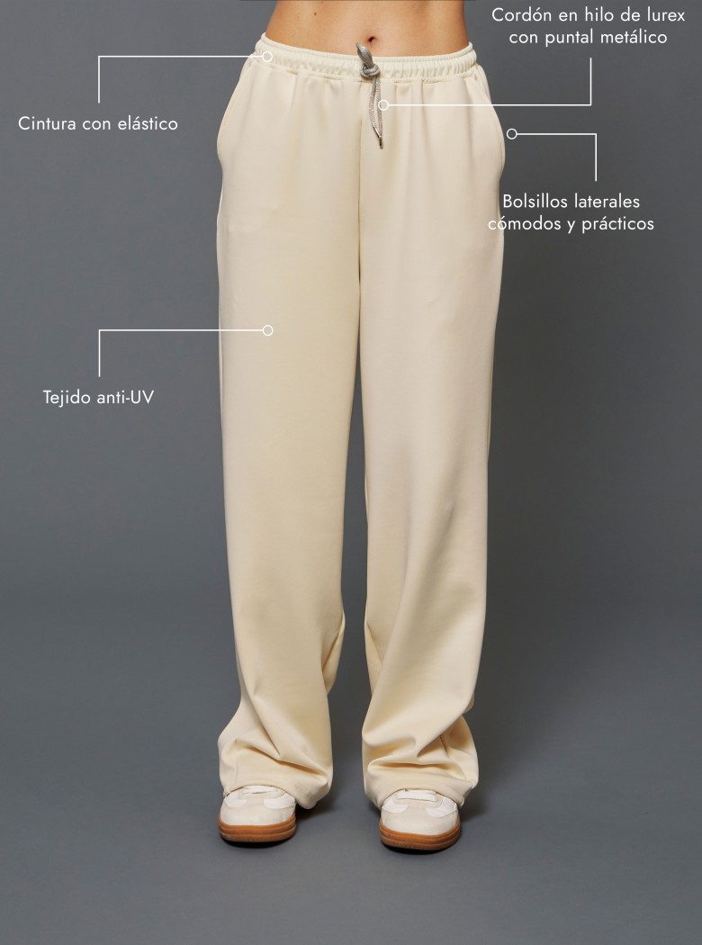 El cordón en hilo de lurex con puntal metálico y la cintura con elástico te garantizan un ajuste perfecto.