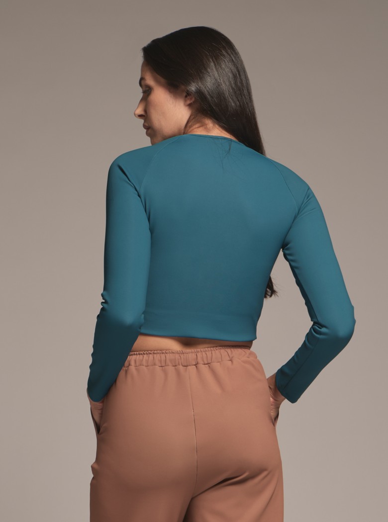 Confectionné en tissu scuba de haute qualité, ce crop top à manches longues sculptant présente des manches raglan qui épousent naturellement les épaules, assurant liberté de mouvement.