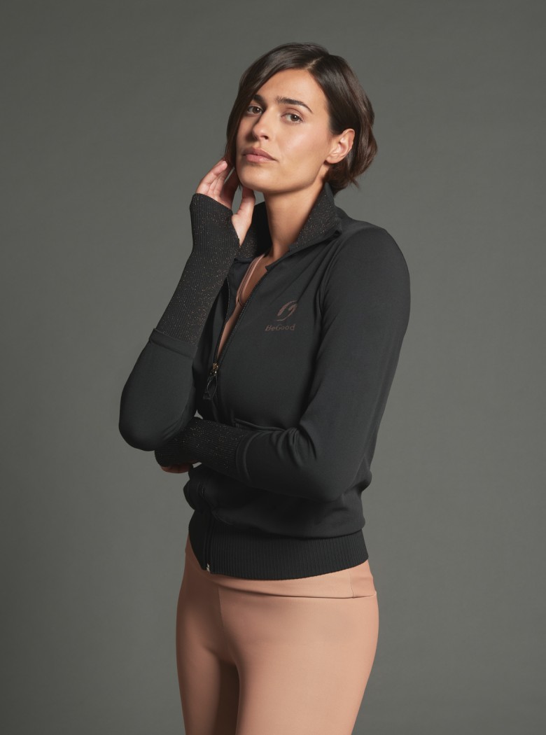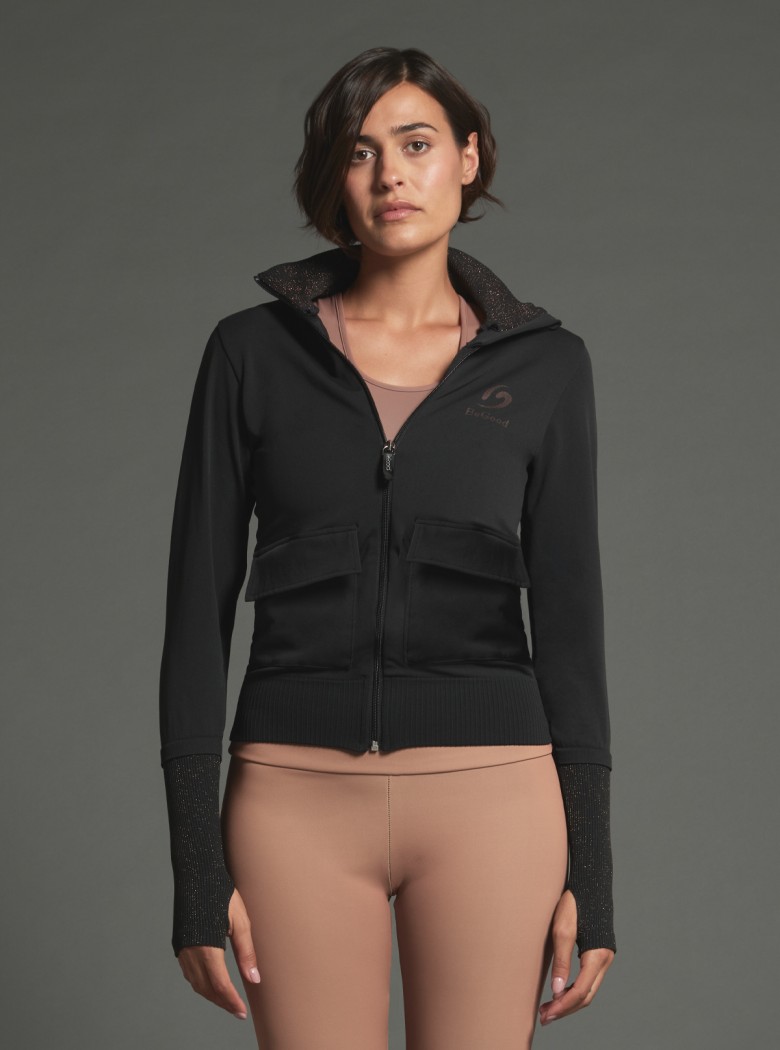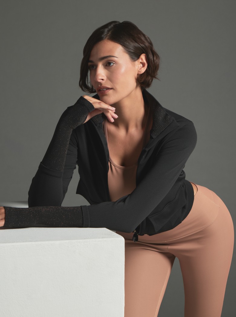 Veste de sport glamour et raffinée avec empiècements en lurex conçue pour les femmes qui veulent prendre soin de leur bien-être, sans renoncer au style.