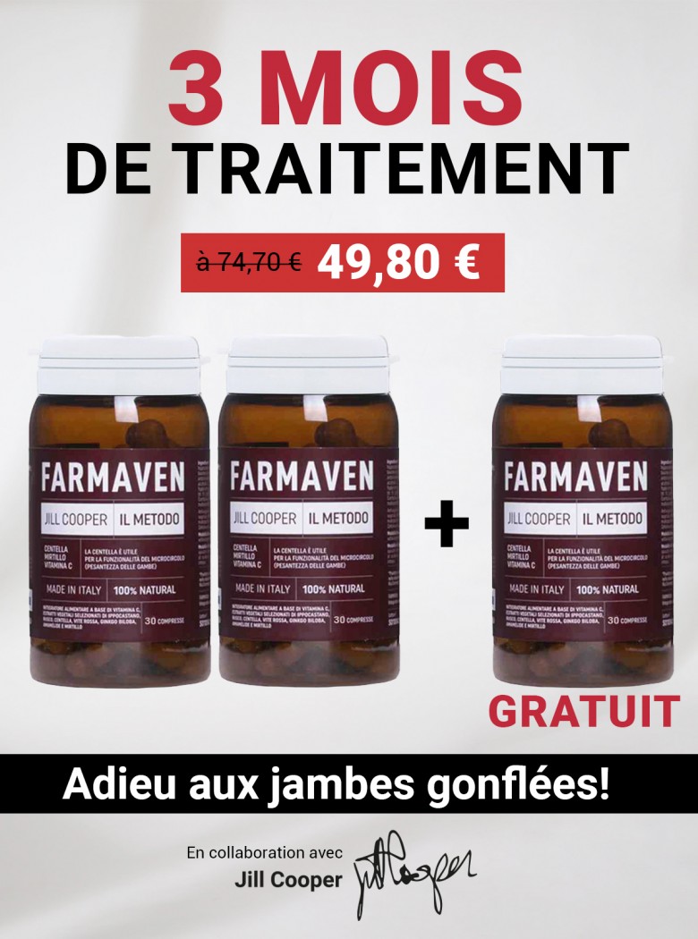 Imaginez une vie sans l'inconfort des jambes lourdes. Avec Farmaven, vous pourrez enfin trouver un soulagement et du bien-être. Créé spécialement pour ceux qui souffrent de jambes gonflées et lourdes, ce complément améliore le retour veineux et la microcirculation, vous offrant des jambes légères et débarrassées de leur lourdeur. De plus, il soutient votre mémoire et vos fonctions cognitives, pour un bien-être total.
