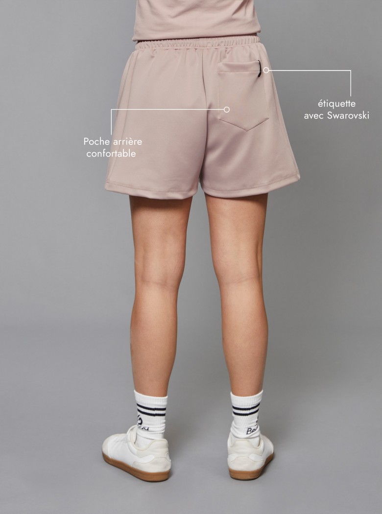 Le design est conçu pour un ajustement optimal : le côté de la jambe est étudié pour s'adapter parfaitement, tandis que les poches latérales, en tissu identique, offrent commodité et praticité. La poche arrière avec l'étiquette intérieure portant le logo Swarovski enrichit encore davantage le design.