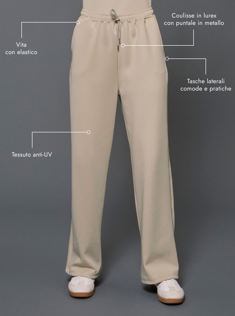 La coulisse in filato lurex con puntale in metallo e la vita con elastico ti garantiscono una vestibilità perfetta.