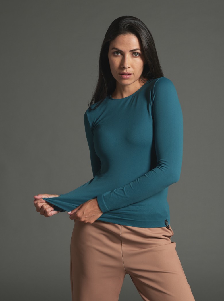 La maglia a maniche lunghe è realizzata in Dermofibra® Cosmetics, per un benessere duraturo: