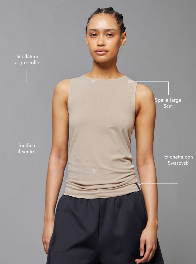 Una canotta che va oltre l'abbigliamento: realizzata in Dermofibra® Cosmetics, avvolge il corpo, tonifica e nutre la pelle, mentre il design elegante e senza cuciture garantisce comfort assoluto.
