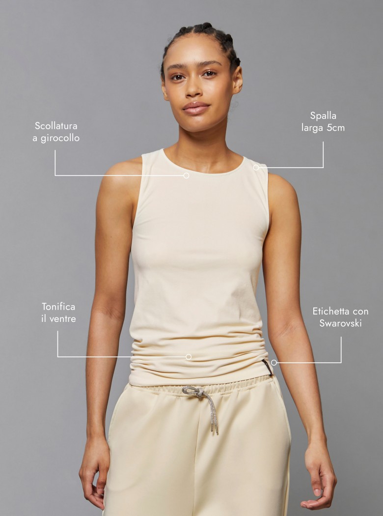 Una canotta che va oltre l'abbigliamento: realizzata in Dermofibra® Cosmetics, avvolge il corpo, tonifica e nutre la pelle, mentre il design elegante e senza cuciture garantisce comfort assoluto.