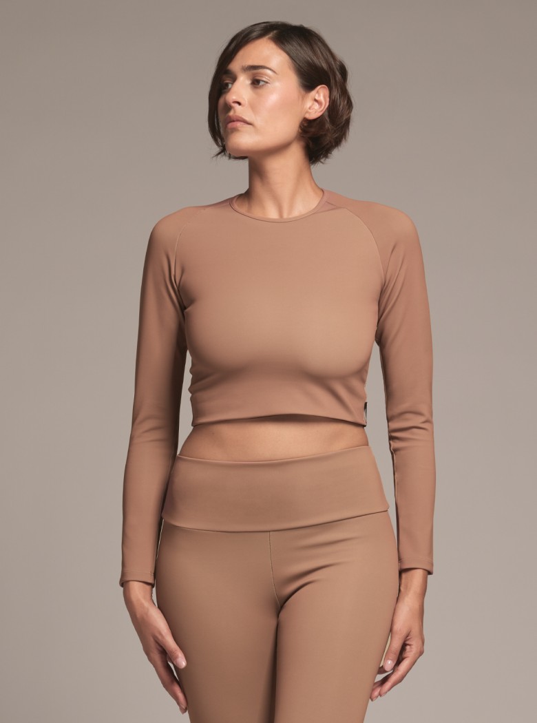 Realizzata in tessuto scuba di alta qualità, questa maglia crop a manica lunga modellante presenta una manica con taglio raglan, che segue con naturalezza le spalle, garantendo libertà di movimento.